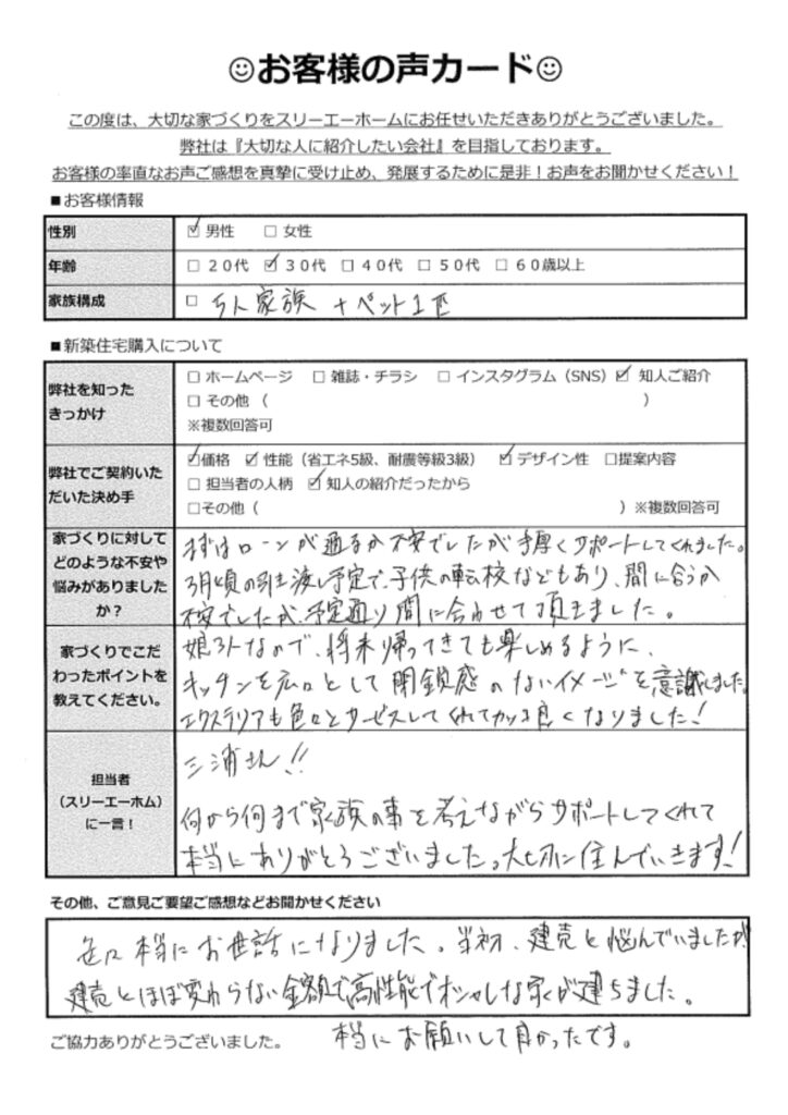 30代男性 Y.M様家づくりに対してどのような不安や悩みがありましたか?→まずはローンが通るか不安でしたが手厚くサポートしてくれました。3月頃の引き渡し予定で、子供の転校などもあり、間に合うか不安でしたが、予定通り間に合わせていただきました。家づくりでこだわったポイントを教えてください。→娘3人なので、将来帰ってきても楽しめるように、キッチンを広々として閉鎖感の無いように意識しました。エクステリアも色々とサービスしてくれてカッコ良くなりました!担当者に一言!→色々本当にお世話になりました。当初、建売と悩んでいましたが建売とほぼ変わらない金額で高性能でおしゃれな家が建ちました。本当にお願いしてよかったです。 |